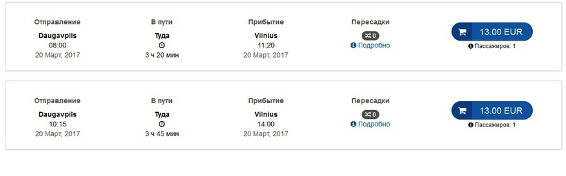 Ниже приведена информация о том, сколько часов вам потребуется, чтобы добраться от Даугавпилса до Вильнюса, а также приведена примерная стоимость проезда (средняя цена билета) на том или ином виде транспорта.
