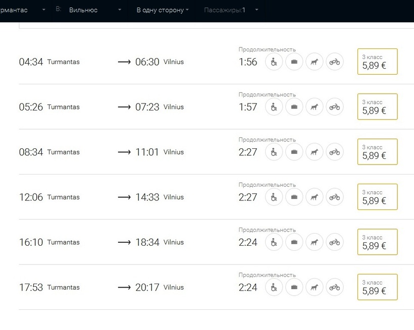 Стоимость билетов Турмантас-Вильнюс составляет от 5,89 евро. Стоит отметить, что такая цена действительна при покупке через интернет. Если вы решите купить билет на вокзале, то придется заплатить на 5 процентов больше. Столько с вас попросят за обслуживание.