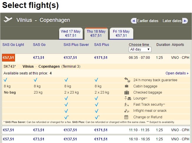 Последнее время все "серьезные" компании вынуждены конкурировать с лоукостерами, они уменьшают цену в основном за счет сдаваемого багажа и питания на борту. SAS не стала исключением: минимальный тариф до Копенгагена начинается от 57,5 евро, но в эту сумму включена лишь ручная кладь. За питание и прохладительные напитки также придется доплатить. А вот кофе и чай нальют бесплатно. Стоимость перелета с багажом начинается от 73,51 евро.