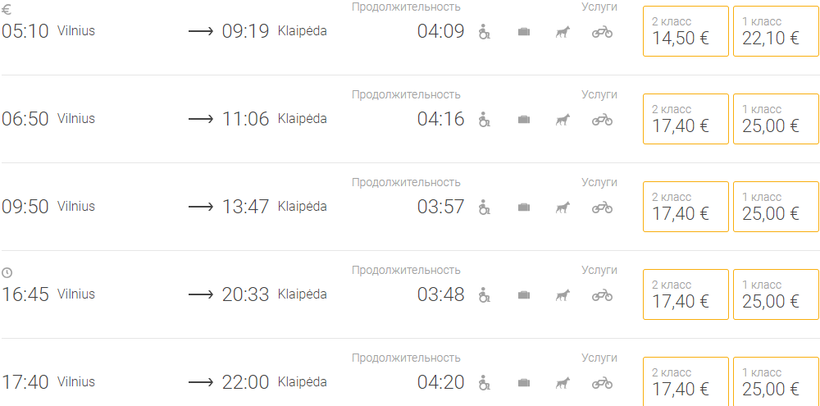 А с ж/д вокзала в Вильнюсе каждый день в Клайпеду отправляется пять поездов — в 05:10, 06:50, 09:50, 16:45 и 17:40. Свой путь они проезжают в среднем за 4 часа.
