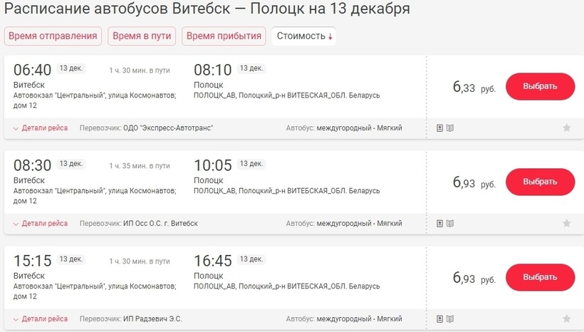 Ниже приведена информация о том, сколько часов вам потребуется, чтобы добраться от Витебска до Полоцка, а также приведена примерная стоимость проезда (средняя цена билета) на том или ином виде транспорта.