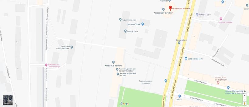 Думаю, хорошо заметно, что железнодорожные вокзалы находятся рядом с автобусными в обоих городах. В Полоцке вообще надо через железнодорожные пути перейти, и все. В Витебске придется чуть наискосок пройти.