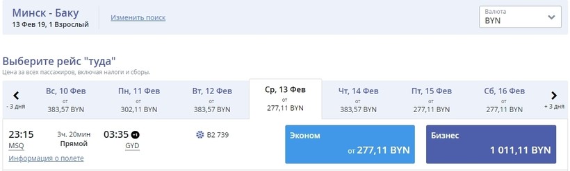 На рейс в Баку — от 211 белорусских рублей (6 500 российских рублей).