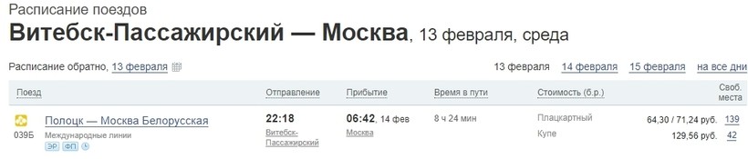 Билет на поезд в Москву обойдется от 64 белорусских рублей (1 970 российских рублей).