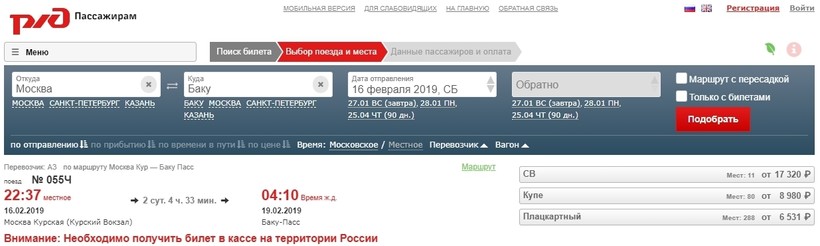 Проездной на поезд в Баку приобретается только в кассах станций на территории РФ.