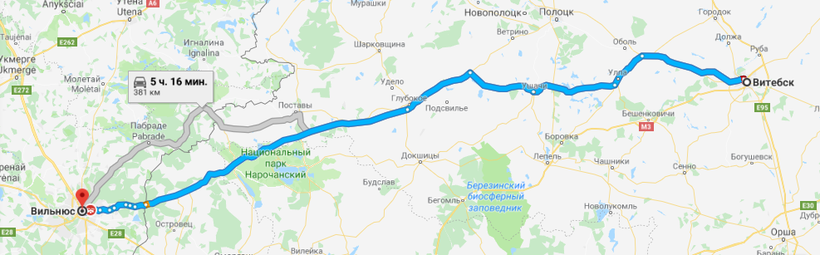 Вильнюс и Витебск разделяют 380 км и международная граница, с учетом прохождения которой расстояние между городами на машине я преодолеваю за 7 часов.