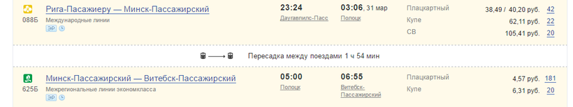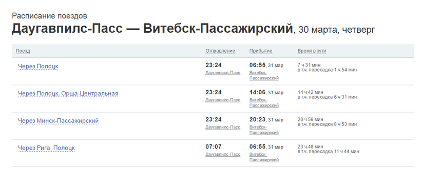 Хочу рассказать еще об одном возможном варианте поездки - о железнодорожном транспорте. Правда тут есть один нюанс - прямого сообщения между городами нет, путешествовать нужно с пересадками. Вот скрин с официального сайта белорусской железной дороги, где показаны возможные способы проезда.