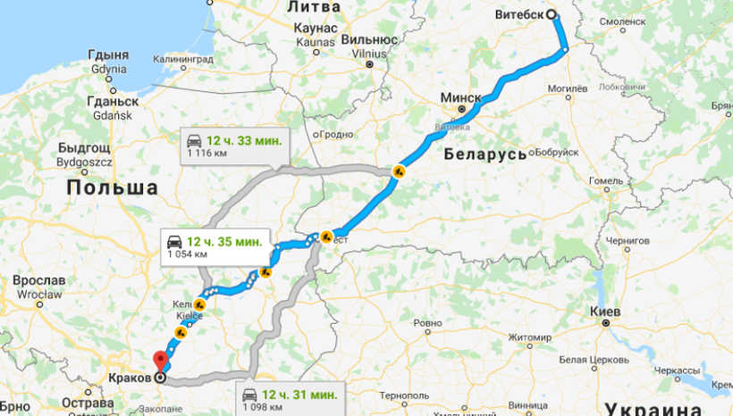 Витебск — Краков — маршрут на карте