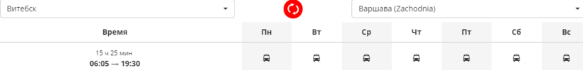 Ежедневно из Витебска в Варшаву в 06:05 отправляется автобус компании Ecolines, который до польской столицы доезжает за 15,5 часов, то есть в Варшаву прибывает в 19:30.