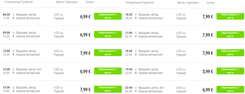 В Краков из Варшавы каждый день отправляется более 12 автобусов компании FlixBus, которые это расстояние преодолевают за 4,5–5,5 часов.