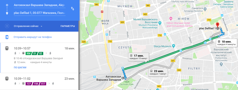 Единственный минус для меня в таком варианте поездки в том, что автобус из Витебска в Варшаву прибывает на автовокзал Варшава-Западная, а последний автобус с Варшава-Западная в Краков отправляется как раз в 19:30. Но есть еще автобус до Кракова в 22:40, который выезжает от Парадной площади (plac Defilad 1) в центре Варшавы. Добраться туда с автовокзала можно за 20 мин. на автобусах KM, S1 или S2, курсирующих с интервалом в 5–10 мин.