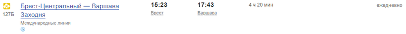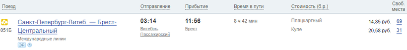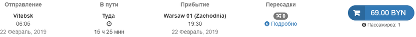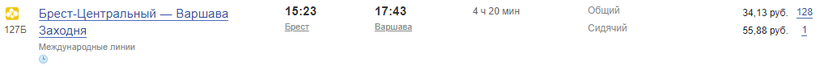 Из Бреста до Варшавы проезд стоит 34,13 BYN (1040 руб. / 14 евро).