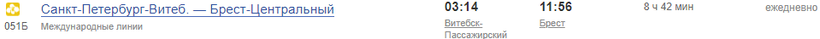 До Бреста из Витебска лучше всего ехать поездом в 03:14 «Санкт-Петербург — Брест», так как он преодолевает этот путь всего за 9 часов.