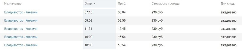 Аэровокзал Владивостока находится в сорока километрах от города. Называется аэропорт «Кневичи». До него вы можете меньше чем за час домчаться на скоростной электричке. Актуальное расписание смотрите на скриншоте.