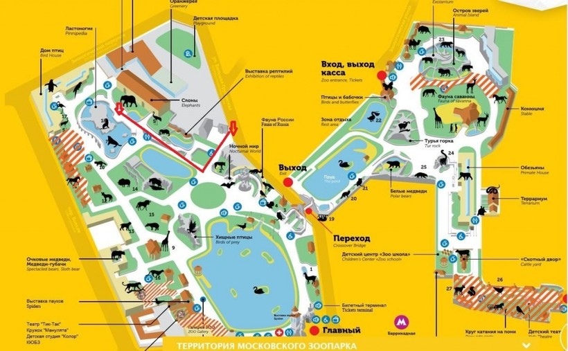 В летний сезон двери Московского зоопарка для любителей живой природы открыты с 07:30 до 19:00. Касса прекращает работать на час раньше. Весной Московский зоопарк работает с 09:00, а зимой – с 10 часов. Чтобы удобнее было ориентироваться на этой громадной территории, предлагаю ознакомиться ниже с его картой.