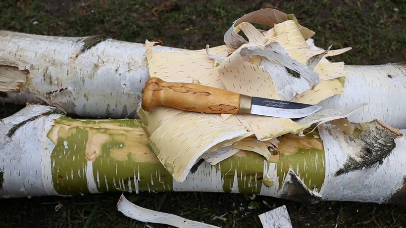 - бересты — мы ее разрывали на тонкие полоски, а потом их вкладывали в свиток из той же бересты (внешняя оболочка защищала растопку от намокания и постепенно разгоралась сама);