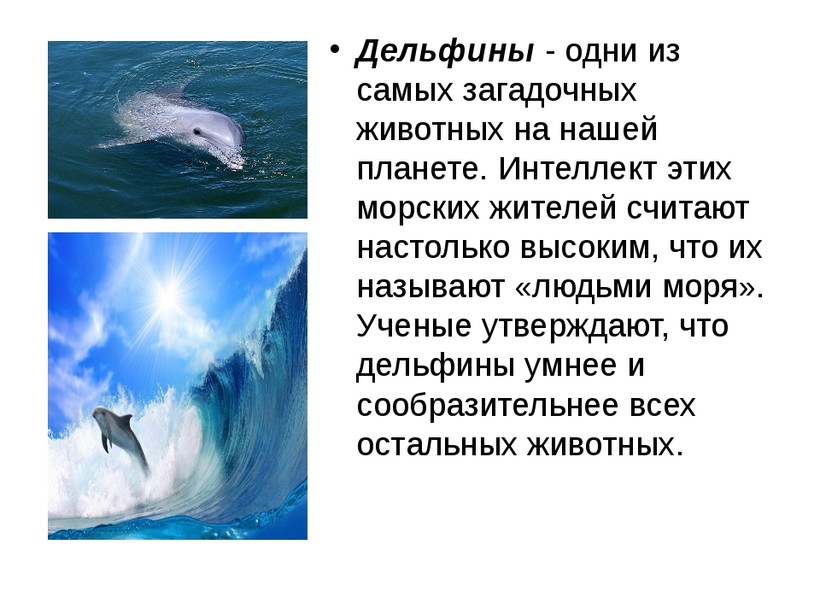 - многие когнитивные и поведенческие реакции на определенные события у дельфинов аналогичны человеческим;