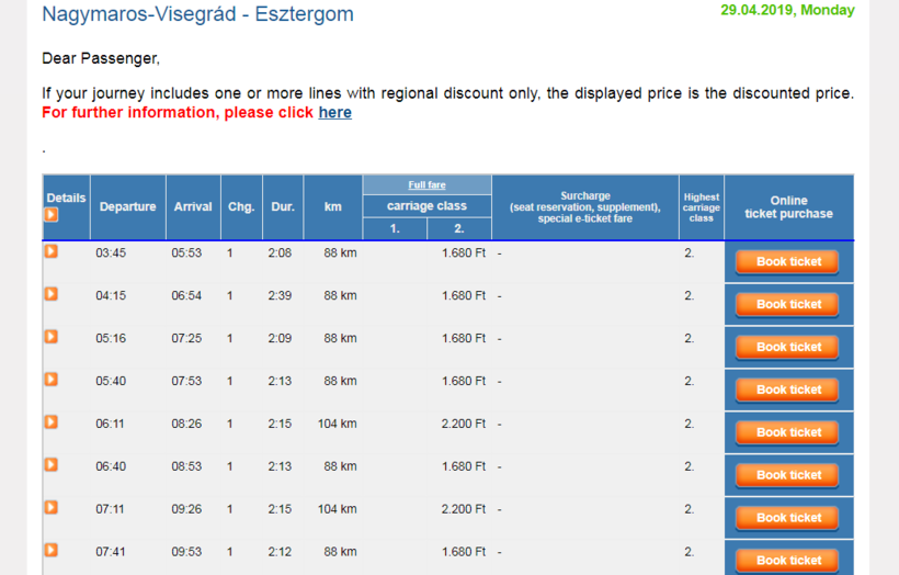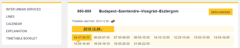 Всем бы странам иметь такой развитый общественный транспорт, как здесь. На одном автобусном сайте можно увидеть все рейсы — сказка! Автобусы на этом участке под номерами 880–889. Они идут из Будапешта через Сентендре и Вышеград до Эстергома. Можно еще один город излучины Дуная посетить одним махом. :) Первый рейс отправляется в 05:43, последний — в 23:56. Автобусы ходят часто, каждые 20–60 минут.