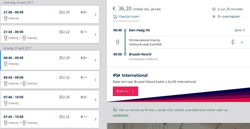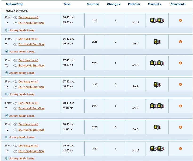 В пути поезд проводит около 2,5 часов. Первые поезда отходят в 6:40 утра, последний рейс отправляется из Гааги в 21:40. В течение дня рейсы отправляются с промежутком примерно раз в час. Поездка с пересадкой предполагает остановку в Роттердаме или Антверпене.