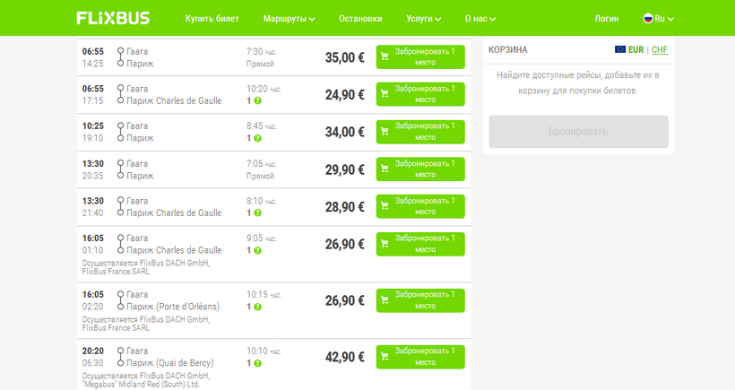 На сайте FlixBus можно посмотреть расписание на интересующую дату и сразу же оформить билет.