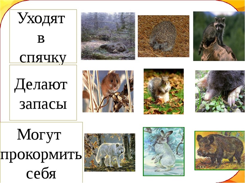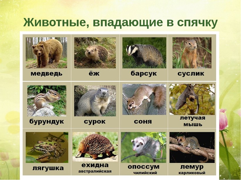 В спячку впадают: бурундуки, медведи, барсуки, сурки, хомяки, ежи. Для сна они готовят себе норы, которые выстилают сухой листвой и травой. А медведи готовят себе постель из веток в берлоге.