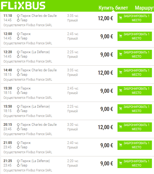 Автобусы от Flixbus отходят из аэропорта Charles de Gaulle в 11.10, с Porte Maillot в 12.00, 18.50, с La Défense в 12.20, 19.10.