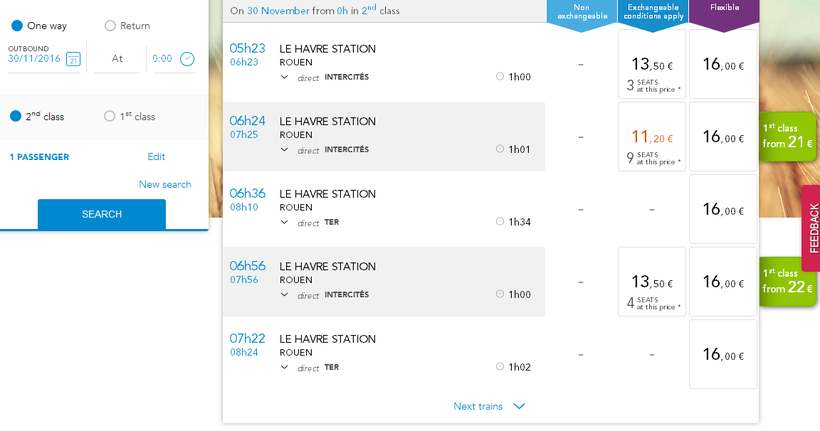 Наиболее недорогой билет в Руан обойдется в 9,5 евро, но в среднем проезд стоит 12-13 евро. Путешествие в первом классе обойдется раза в два дороже, но особого смысла приобретать билет в такой вагон я не вижу – отличия между классами минимальные.