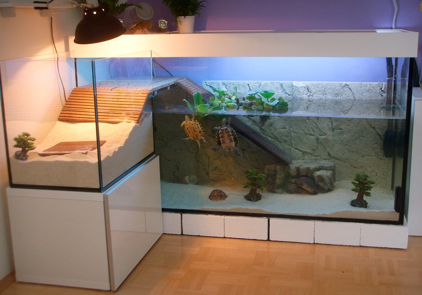 Моей черепашке, как оказалось, всего около 5 лет. Совсем малышка. Учитывая, что красноухие черепахи могут жить до 30 лет, чего бы и мне хотелось. Благоприятные условия для проживания — залог долгой жизни. Домом для черепахи должен служить террариум с искусственной сушей, который вмещает в себя до 200 литров воды. Над сухим островком необходимо разместить лампу для обогрева животного. Также нужна УФ-лампа для дополнительного освещения.