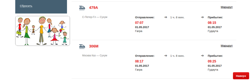 Как ясно из вышеизложенного, в обоих городах имеются железнодорожные вокзалы. Собственных железнодорожных перевозчиков в Абхазии нет, но все-таки на поезде доехать можно. В определенные даты можно проехаться на поездах, следующих в Сухуми из Санкт-Петербурга или же из Москвы. Вот скриншот с сайта РЖД: