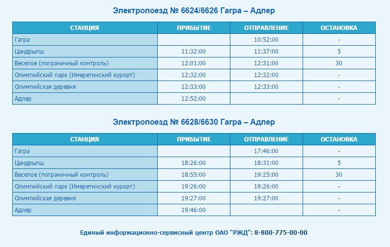 Электричка удобнее поезда, ходит она дважды в день, но прямиком до Сочи доехать не получиться, только до Адлера. Дорога занимает два часа.