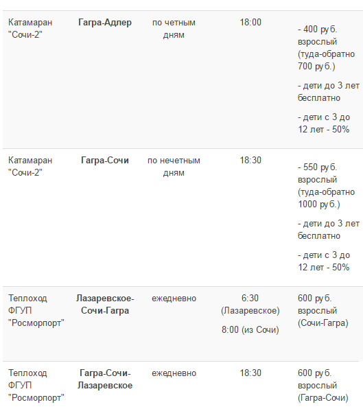 Также из Гагры в Сочи можно добраться по морю на корабле. Вот скрин расписания, но обязательно уточняйте его на месте, так как оно может меняться из-за погодных условий. Водный путь один из самых коротких – примерно полтора часа пути.