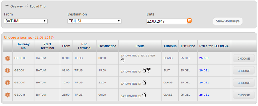 Билеты на поезд Батуми – Тбилиси можно приобретать в кассах ЖД вокзала. Есть ещё сайт грузинских железных дорог, но там с покупкой билетов всё сложно, он подходит больше для просмотра расписания. Билеты на автобус Батуми – Тбилиси можно купить или на автовокзале, или забронировав их на сайте компании «Metro».