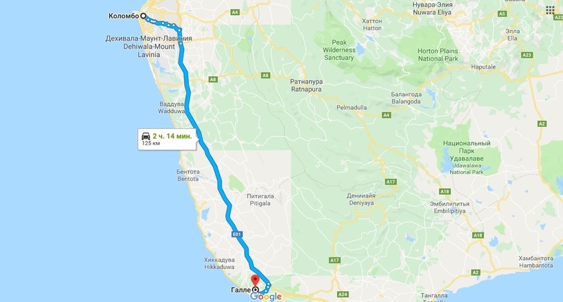 Коломбо — Галле — маршрут на карте