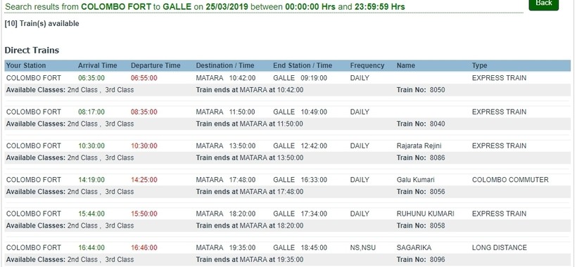 График доступен на веб-странице железной дороги Шри-Ланки. Ехать таким транспортом придется 3–3,5 часа. Стартуют поезда с железнодорожного вокзала Fort.