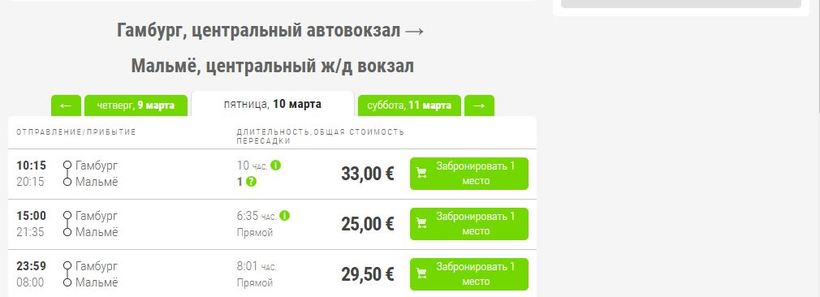Автобусный вариант, как по мне, полностью несостоятелен. В любом случае он предполагает пересадки. Опишу один из вариантов подробно, а про второй упомяну. Итак, сначала автобусом компании FlixBus следует из Гамбурга добраться до Мальмё. В этом направлении есть всего 2 прямых автобуса:
