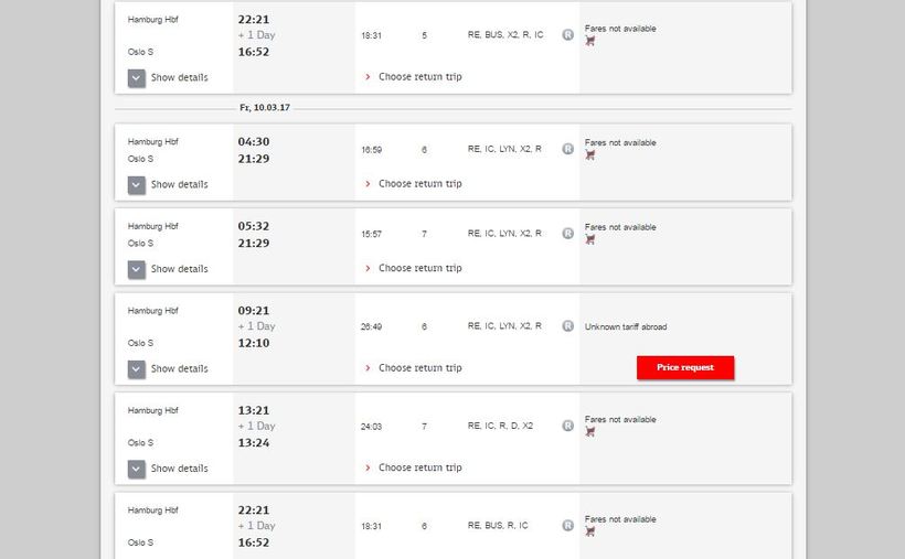 В принципе, поезда конечно ходят, и железные дороги в Германии неплохие, о них почитать можно вот в этой статье. Но вот ехать в Осло на поезде это полное безумие, стоит лишь посмотреть на скриншот с сайта немецких железных дорог: