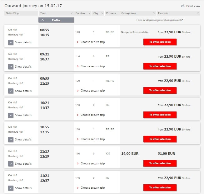 Из Киля в Гамбург ходят как скоростные поезда, так и региональные. Подробно о видах поездов, тарифах, способах покупки билетов вы можете прочитать в этой статье. Поездка на скоростном поезде займет чуть больше часа, на региональном - 1 ч. 20 мин., разница во времени небольшая, так что можно выбирать тот поезд, который больше подходит по времени. Поезда ходят часто, несколько раз в час. Поезд отправляется с Центрального железнодорожного вокзала Киля и прибывает на Центральный железнодорожный вокзал Гамбурга, расположенный в самом центре города. Расписание можно посмотреть на сайте немецких железных дорог.