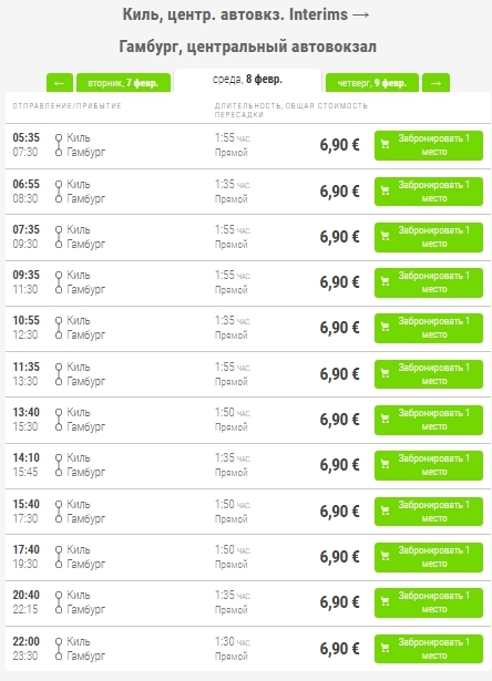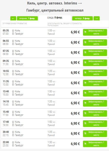 Автобус отправляется с центрального автовокзала Киля и прибывает на центральный автовокзал Гамбурга.