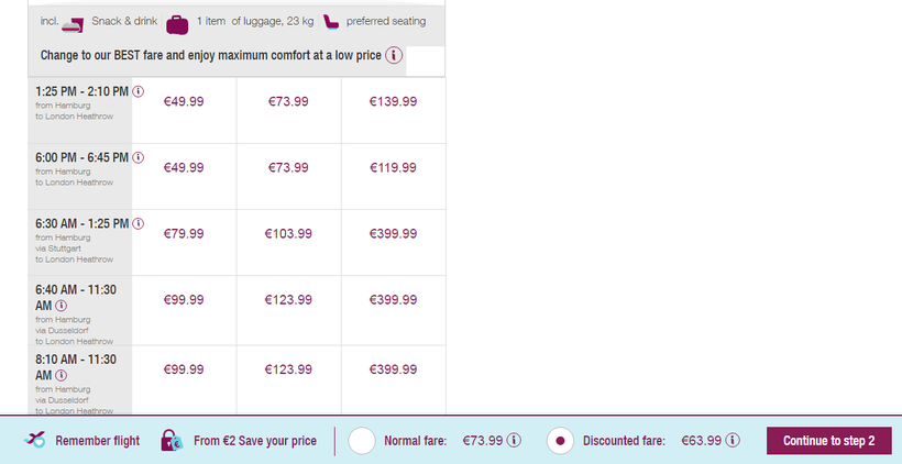 Билет на самолет Eurowings будет стоить от 49,99 (просто перелет без багажа и питания). За более комфортные условия и возможность взять с собой чемодан придется заплатить 73,99 евро. Перелет в бизнес-классе обойдется от 119,99 евро.