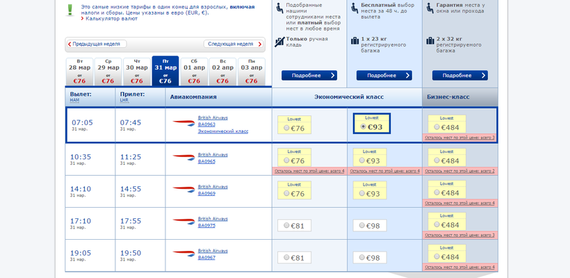 Билет на самолет авиакомпании British Airways на порядок дороже. Самый дешевый билет обойдется в 76 евро, экононом – от 93, а бизнес – аж 484 евро в одну сторону!