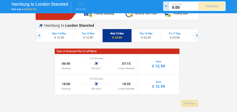 Самолеты авиакомпании Ryanair вылетают из Гамбурга дважды в сутки: в 06:40 и в 18:00. В воздухе нужно будет провести 1 час и 35 минут.