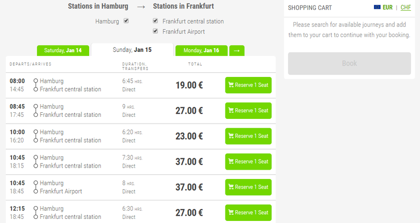 Ниже приведена информация о том, сколько часов вам потребуется, чтобы добраться от Гамбурга до Франкфурта-на-Майне, а также приведена примерная стоимость проезда (средняя цена билета) на том или ином виде транспорта.