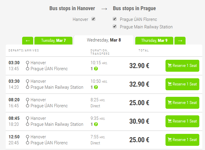 Ниже приведена информация о том, сколько часов вам потребуется, чтобы добраться от Ганновера до Праги, а также приведена примерная стоимость проезда (средняя цена билета) на том или ином виде транспорта.