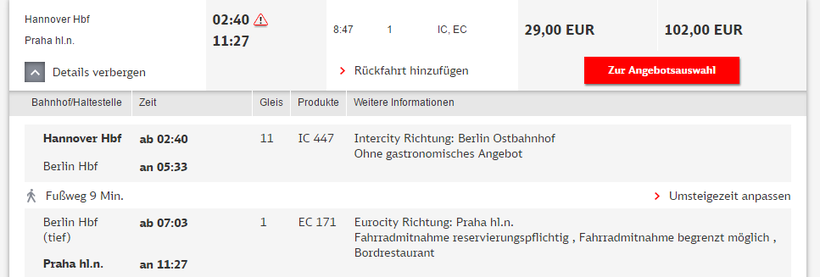 Отправка поездов в сторону Праги происходит с центральной станции Ганновера.