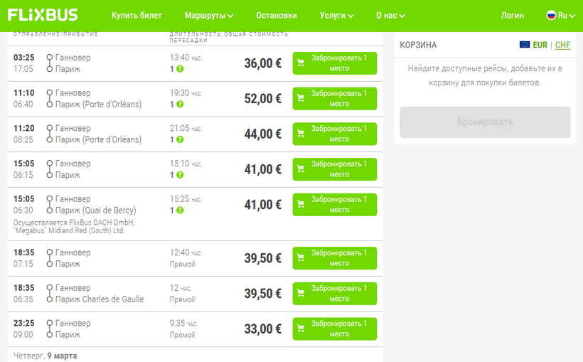 - «Flixbus». Я сам добирался летом до Парижа как раз этим автобусом. В день с Центрального автовокзала Ганновера отправляется несколько рейсов, дорога занимает от девяти с половиной до тринадцати часов. Не стоит пугаться такой долгой поездки, все рейсы – ночные, а автобусы у «Flixbus» очень комфортабельные, там и кресла мягкие, и туалет есть в салоне, и wi-fi бесплатный. Нашим автобусам до такого далеко. В Париже у автобусов есть несколько конечных остановок, вокзал прибытия нужно смотреть исходя из условий конкретного рейса. Всю необходимую информацию – адреса остановок и точное расписание можно узнать на сайте компании.
