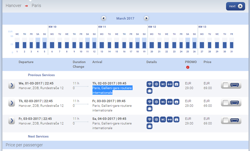 - «Eurolines». У этой компании есть только один рейс в день с того же автовокзала Ганновера. Автобус «Eurolines» тратит на дорогу 11 часов, он также выезжает вечером и прибывает в Париж с утра. Даже условия в салоне примерно такие же, как у «Flixbus» – туалет, wi-fi и мягкие сиденья. Отличается только автовокзал прибытия, «Eurolines» приезжает в «Paris-Gallieni». У этой компании тоже есть сайт с расписанием.