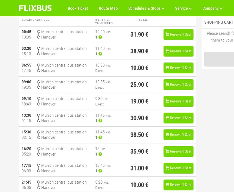 Билеты стоят от 20 до 40 евро, смотря какой рейс, с пересадкой или без. Расписание и цены можно так же посмотреть на сайте FlixBus, очень удобный интерфейс, есть и на русском языке.
