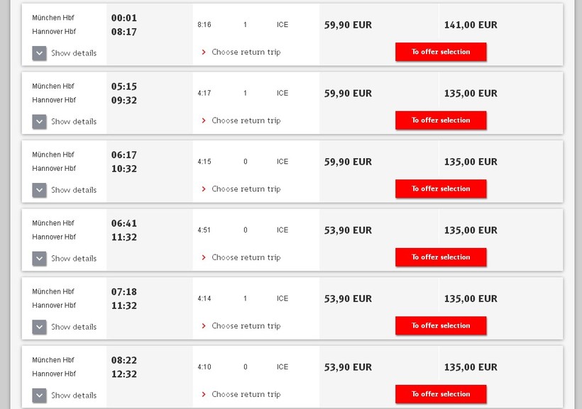 Стоят билеты на этот поезд порядка 60 евро. Если прямой поезд, то будет дешевле, около 54 евро. Цены на билеты и расписание можно посмотреть на сайте «Deutsche Bahn».