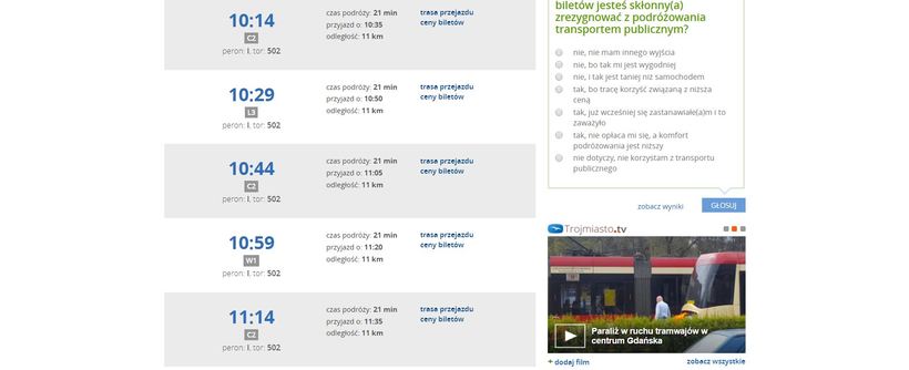 Отправляются поезда с главного вокзала Сопота, это здесь: А прибывают поезда на главный вокзал Гданьска: Удобств в электричке также особых нет, так что рассчитывать следует разве что на следование по графику. Я чаще ездил именно на электричке, поскольку те ездят достаточно часто – примерно каждые минут 10-15. Вот, лишь маленький фрагмент расписания: