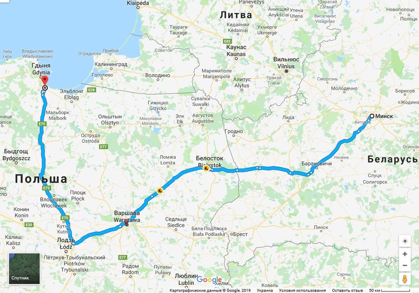 Минск — Гданьск — маршрут на карте